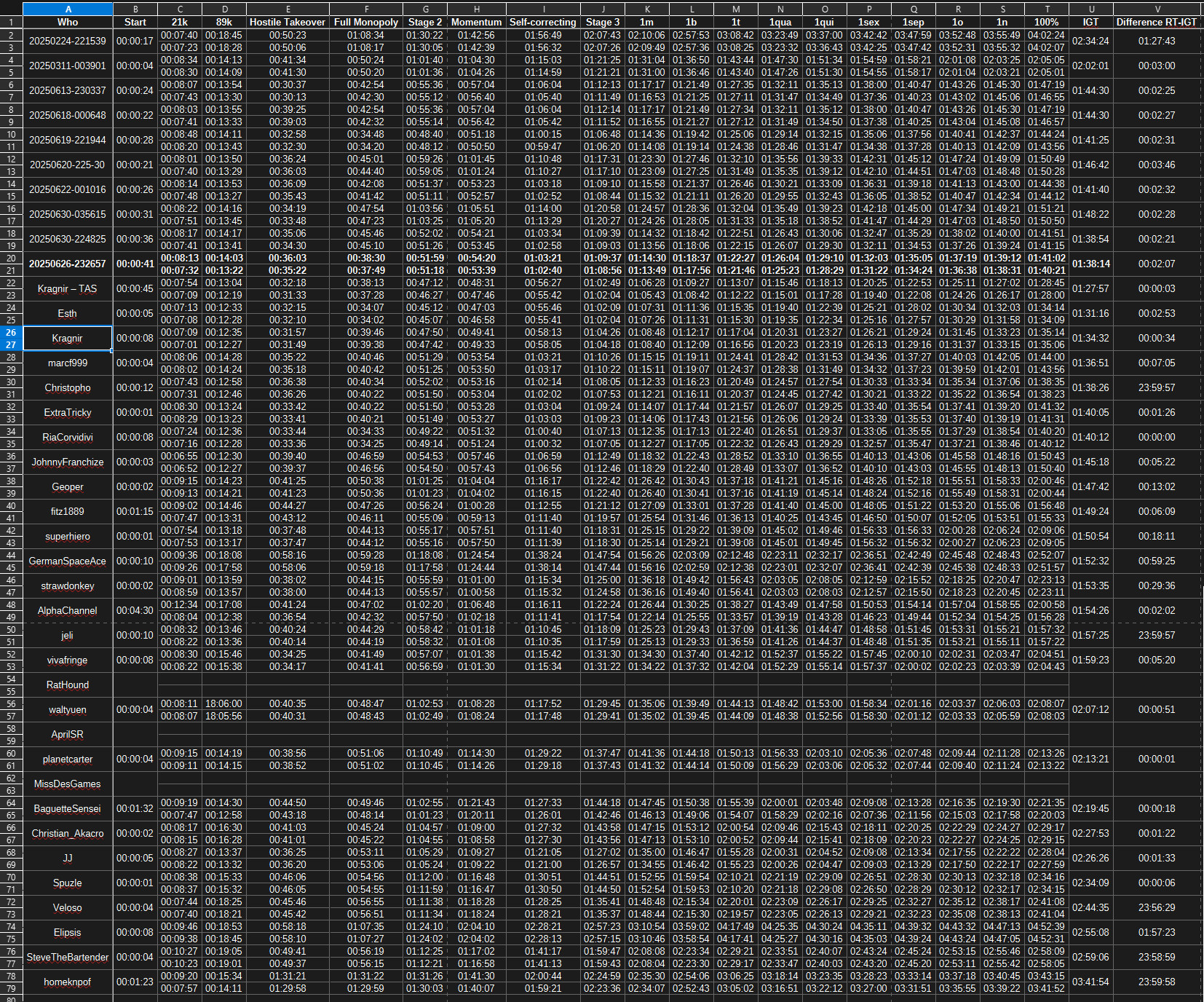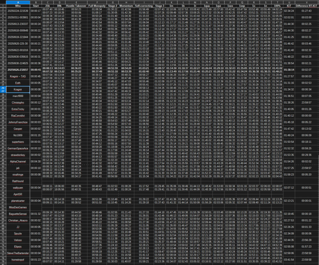 Still not enough compared to other runs so I started to analyze the code since it’s just JavaScript with the help of ChatGPT. Took 31 more runs to reach sub 1h50m. At this point I started calculating my time with IGT since speedrunners seems to be using that value more than RT. Took about 20 more runs to reach 1h45m constantly but still not enough. I then made a big spreadsheet with every speedrunners taking down their time at many steps in the game and compare them to my own time. Was able to realize I was making mistakes in a few parts of the game.